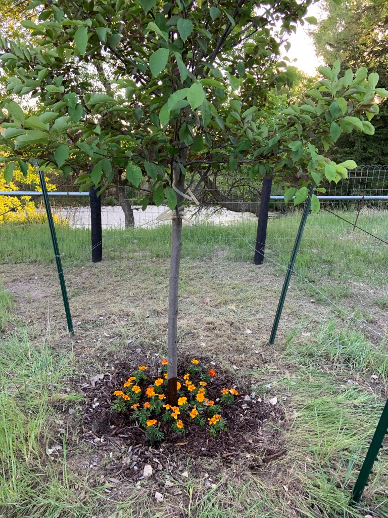 When the tree was first planted, a small fence was put up right around the base of it to protect it from all the deer and wildlife. It has served it’s purpose. The tree is stronger and much taller than when it was first planted. It has survived MANY strong Kansas wind storms!